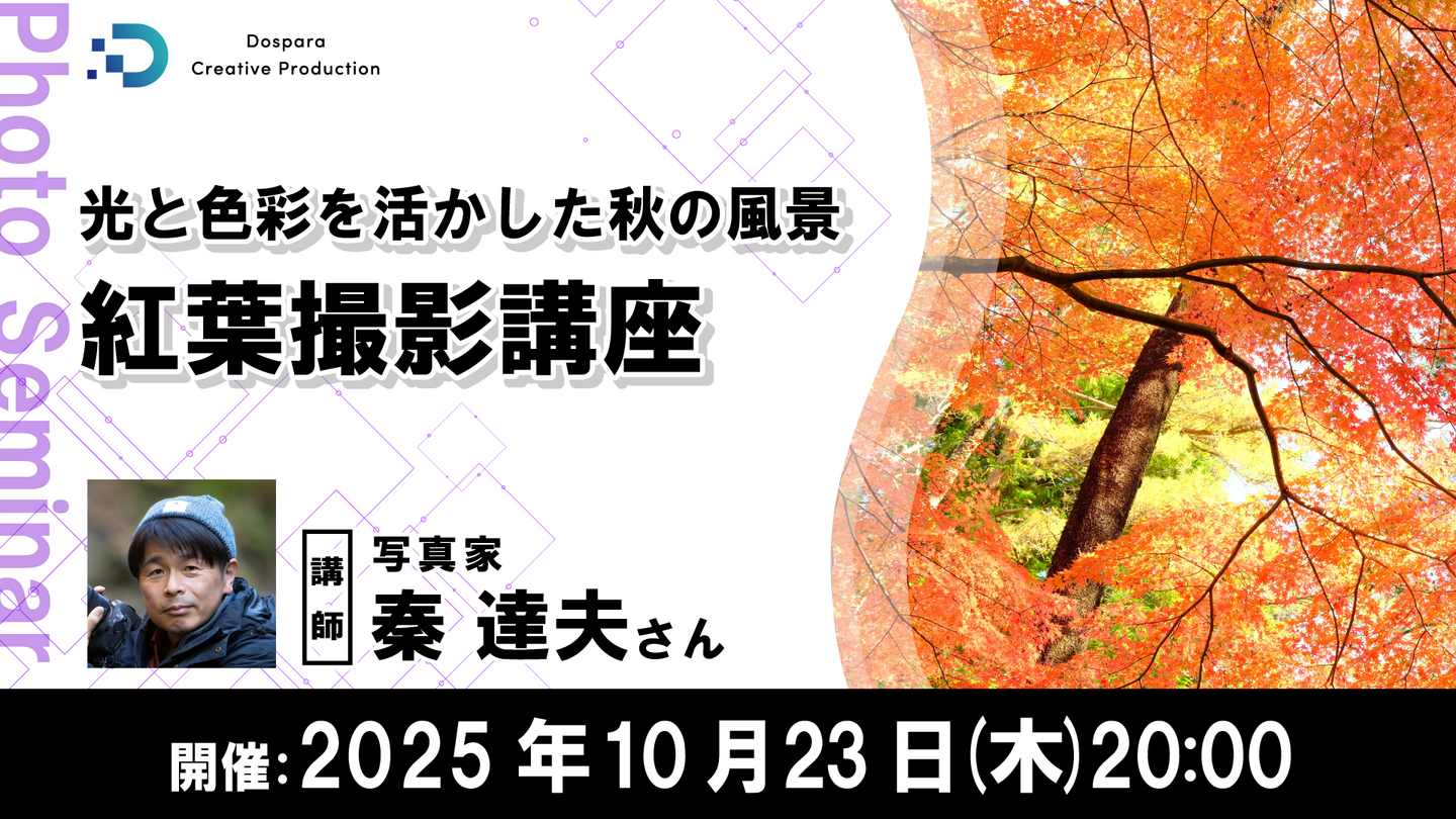 ドスパラは、写真家の秦達夫氏を講師に迎え、『光と色彩を活かした秋の風景 紅葉撮影講座』を2025年10月23日(木)20時よりオンラインで開催します。現在、参加者を募集しています。